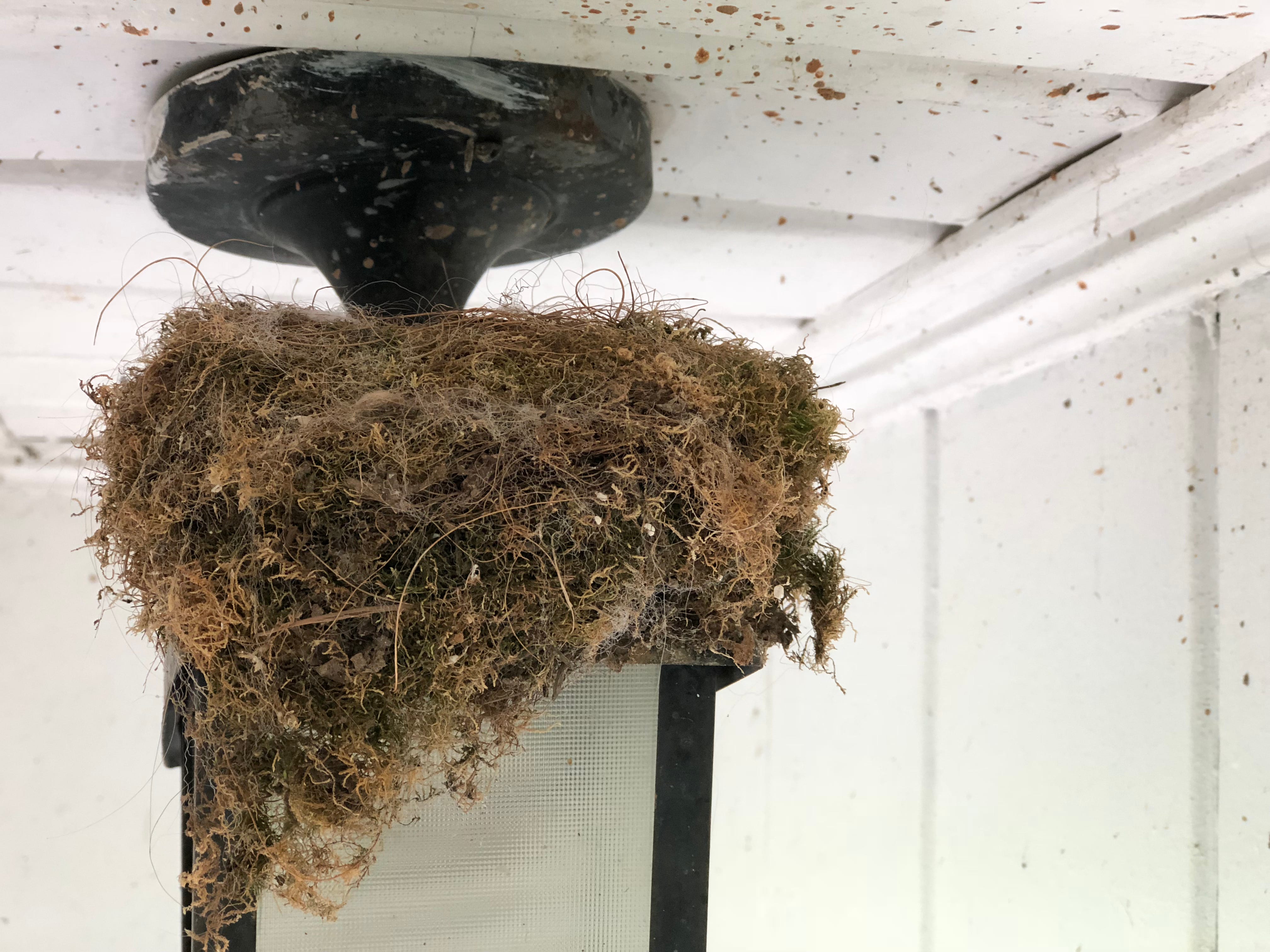 It was a random spring day in 2017—we’ll say April since April is the springiest of all months. I opened the rarely used front door, and something shot out into the yard. It was small and fast and scared the bejeebus out of me. I looked up, and there, balanced on the side of the light fixture, was a bird’s nest.