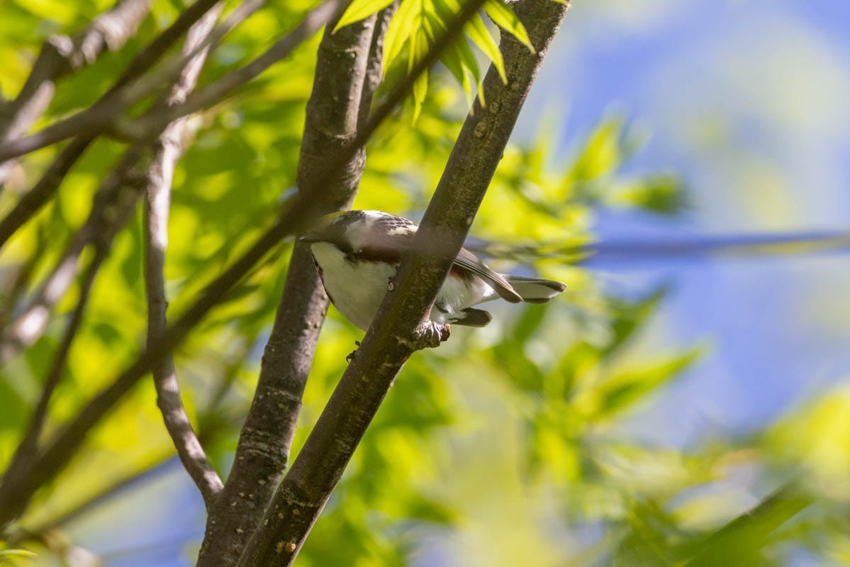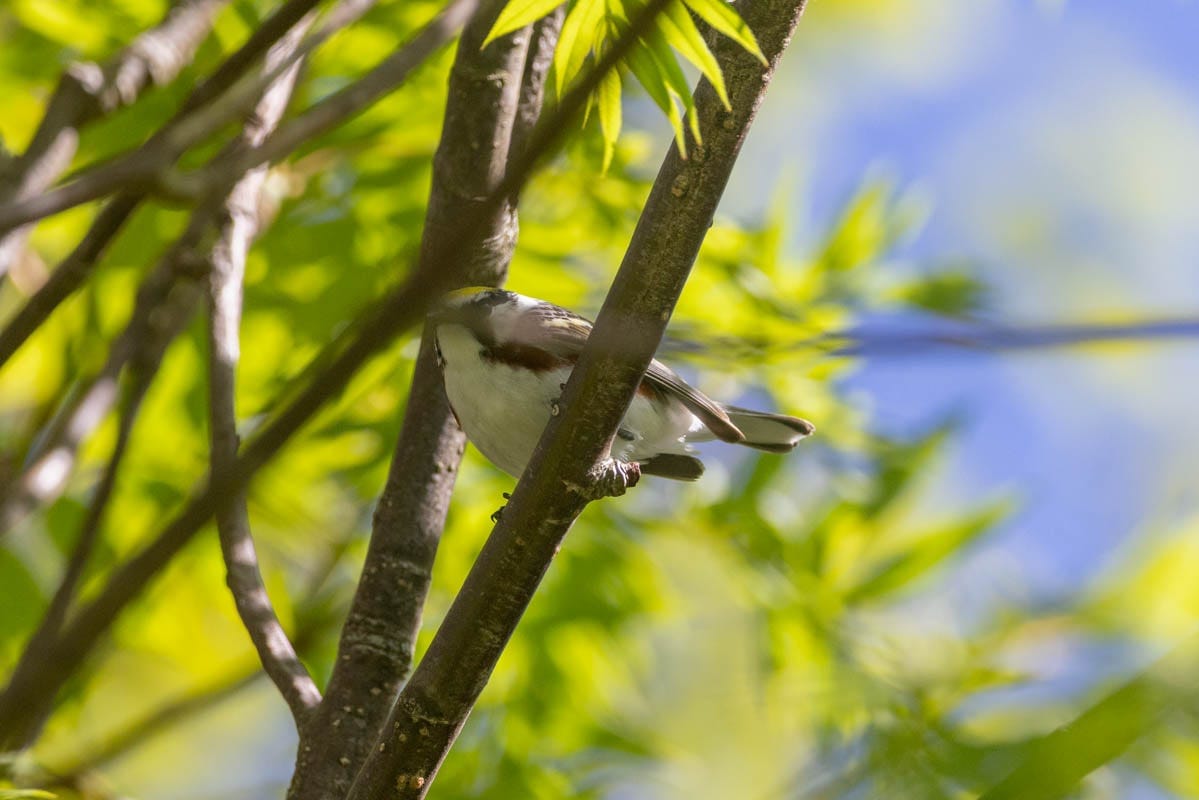 After my hike and returning to a place with reliable cell service, I pulled up my Merlin app. Going through the checklist of info (sparrow size, perched on a bush, red, black, yellow, white), I got my bird—a Chestnut-sided Warbler.