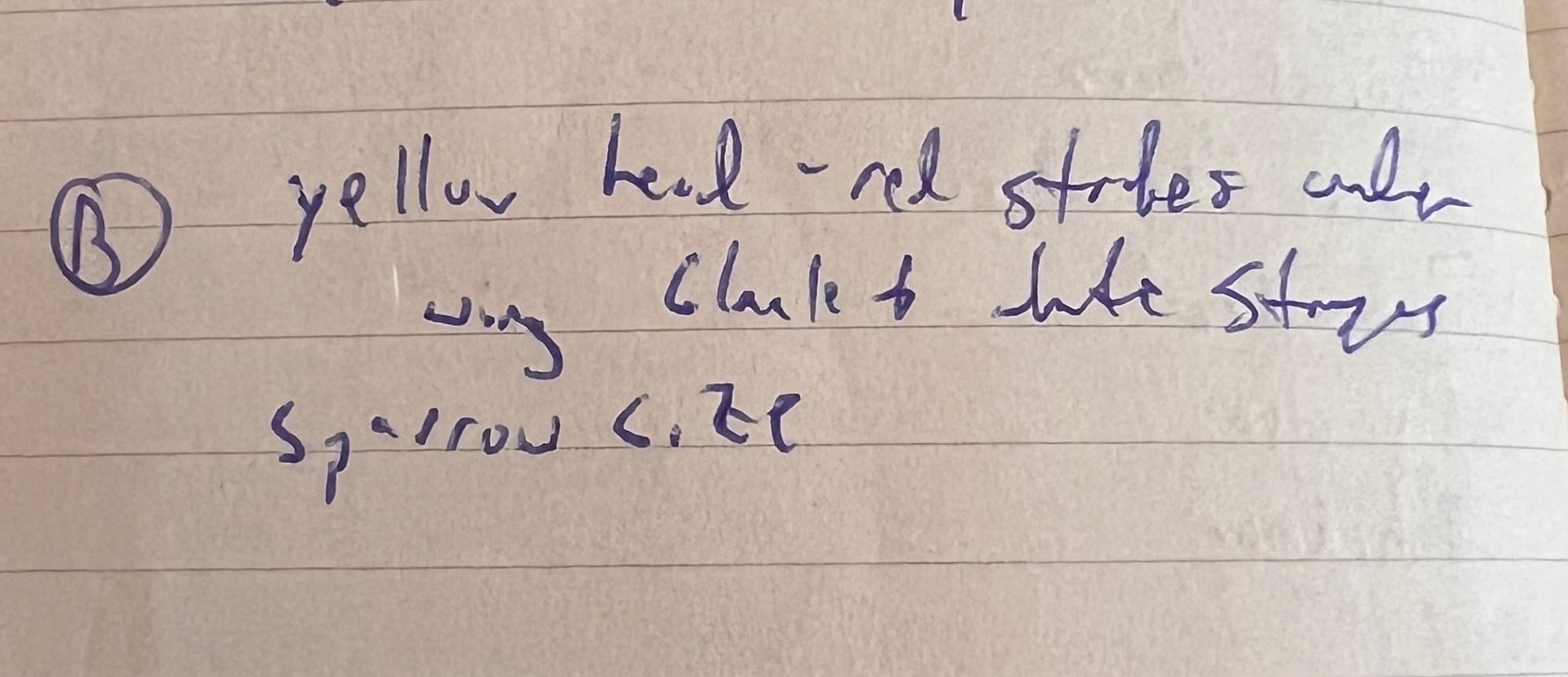 I quickly pulled out my notebook that I carried for IDs and scribbled “yellow head - red stripes under wing black and white stripes sparrow size.”